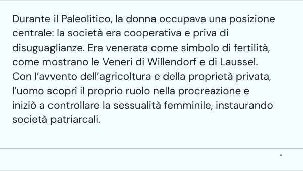 Durante il Paleolitico, la donna occupava una posizione centrale: la società era cooperativa e priva di disuguaglianze. Era venerata come simbolo di fertilità, come mostrano le Veneri di Willendorf e di Laussel. Con l’avvento dell’agricoltura e della proprietà privata, l’uomo scoprì il proprio ruolo nella procreazione e iniziò a controllare la sessualità femminile, instaurando società patriarcali.