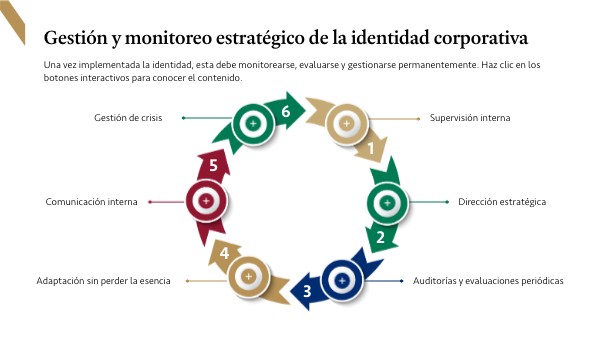 Una vez implementada la identidad, esta debe monitorearse, evaluarse y gestionarse permanentemente. Haz clic en los botones interactivos para conocer el contenido.