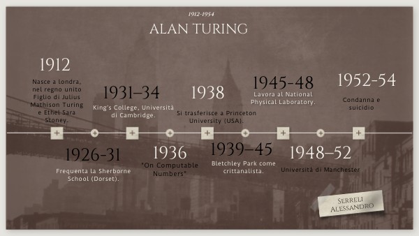 Alan Mathison Turing nasce il 23 giugno 1912 a Londra, in una famiglia della classe media inglese.Fin da bambino dimostra una curiosità insaziabile per la logica e il funzionamento delle cose. I genitori, spesso assenti per lavoro in India, lo lasciano crescere con amici e parenti. Questa infanzia solitaria alimenta il suo mondo interiore e la sua indipendenza mentale. La sua mente brillante inizia presto a distinguersi per originalità e pensiero astratto.