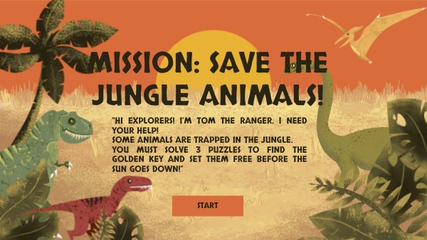 “Hi explorers! I’m Tom the Ranger. I need your help! Some animals are trapped in the jungle. You must solve 3 puzzles to find the Golden Key and set them free before the sun goes down!”