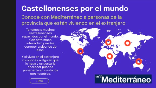 Tenemos a muchos castellonenses repartidos por el mundo. Con este mapa interactivo puedes conocer a algunos de ellos. Y si vives en el extranjero o conoces a alguien que lo haga y os gustaría aparecer puedes ponenerte en contacto con nosotros.
