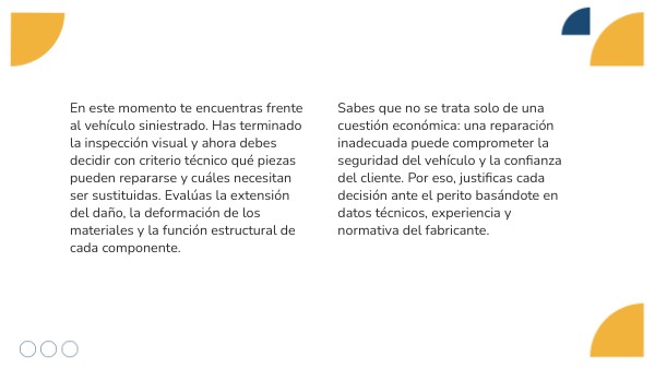 En este momento te encuentras frente al vehículo siniestrado. Has terminado la inspección visual y ahora debes decidir con criterio técnico qué piezas pueden repararse y cuáles necesitan ser sustituidas. Evalúas la extensión del daño, la deformación de los materiales y la función estructural de cada componente.