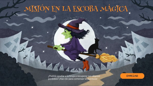 La bruja viajaba en su escoba junto a su gato cuando, por culpa del viento, empezó a perder algunas de sus cosas: primero el sombrero, luego el lazo y más tarde la varita.Ahora necesita tu ayuda para recuperar cada objeto. ¿Listo para comenzar?