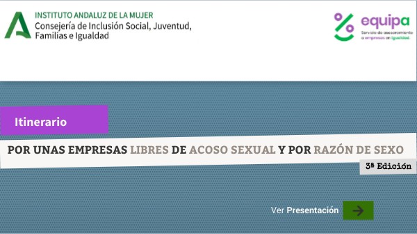 La igualdad entre mujeres y hombres en el empleo es uno de los retos a los que se enfrenta la sociedad de nuestros días, una igualdad real y efectiva. El Instituto Andaluz de la Mujer, tiene entre sus compromisos apoyar a las empresas en el cumplimiento con la legislación, de manera que la integración de la igualdad sea una práctica habitual de todas las empresas de Andalucía. Con estas premisas, el IAM viene desarrollando el Servicio EQUIPA desde 2018, ofreciendo un asesoramiento experto para que las empresas andaluzas desarrollen medidas y planes de igualdad. Una de las líneas de actuación fundamental la constituye el impulso para la elaboración y establecimiento de medidas y protocolos para la prevención del acoso sexual y por razón de sexo en las empresas.