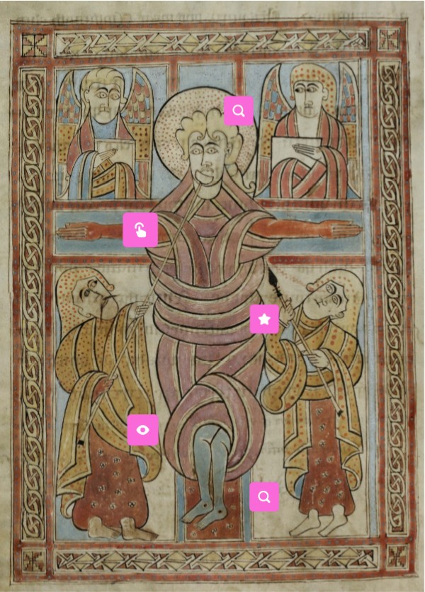 This image differs from the images of the Crucifixition that we get from Coptic illuminated manuscripts. In the Coptic manuscripts, they never actually show Jesus on the cross, instead, they use imagery such as lambs to stand in for him. The Celtic manuscripts seem to have no problem showing him actively on the cross, however. This was due to differing opinions over his physical body being sacrificed vs his spirit, which itself could be due to the fact that Celtic Christianity was more influnced by Rome, while Coptic Christianity was more influenced by Byzantium.