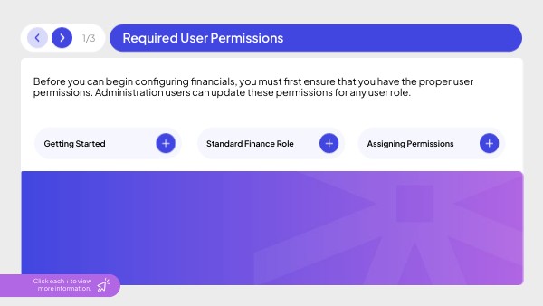 Before you can begin configuring financials, you must first ensure that you have the proper user permissions. Administration users can update these permissions for any user role.