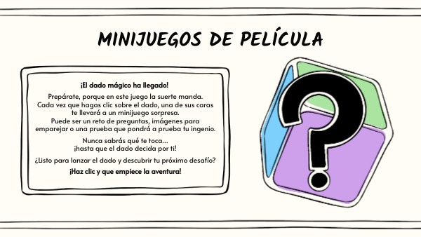 ¡El dado mágico ha llegado! Prepárate, porque en este juego la suerte manda.Cada vez que hagas clic sobre el dado, una de sus caras te llevará a un minijuego sorpresa.Puede ser un reto de preguntas, imágenes para emparejar o una prueba que pondrá a prueba tu ingenio. Nunca sabrás qué te toca…¡hasta que el dado decida por ti! ¿Listo para lanzar el dado y descubrir tu próximo desafío? ¡Haz clic y que empiece la aventura!