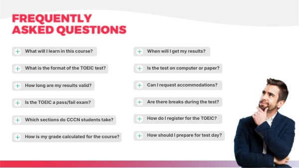 You’ll learn strategies to help you get your best possible TOEIC score. The focus is on using your English effectively during the test — not on learning from zero. You’ll practice how to: • Understand the TOEIC format and timing. • Manage your time efficiently. • Identify the best answers quickly. • Avoid traps and tricky distractors. • Build confidence through mock tests and feedback.