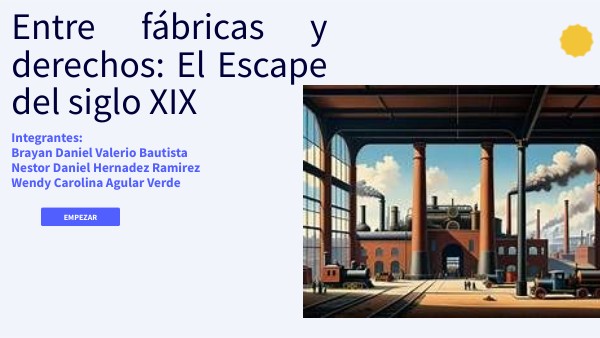 Año 1880. Estás atrapado en una enorme fábrica en plena Segunda Revolución Industrial.El aire está lleno de humo, las máquinas no paran y los trabajadores exigen justicia. Para escapar, deberás demostrar tus conocimientos sobre las luchas sociales y laborales del siglo XIX. ¡Resuelve los acertijos, descubre las claves , libera a los obreros ,para lograr escapar con la historia de mexico!