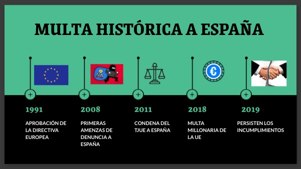 El TJUE impone una multa histórica a España: • Pago único de 12 millones de euros. • Multa coercitiva semestral de 11 millones hasta que cumpla. Motivo: seguían 17 municipios sin tratamiento adecuado, entre ellos: Santiago de Compostela, Vigo, Gijón, Matalascañas (Huelva), o Benicarló (Castellón).