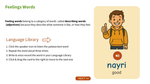1. Click the flashing icon to hear the palawa kani feeling words2. Say the word out loud three times 3. Write & voice record the word in your language library