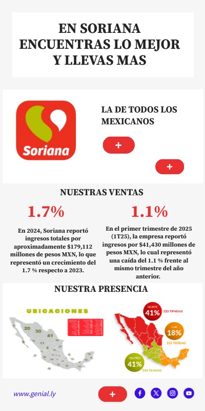 En 2024, Soriana reportó ingresos totales por aproximadamente $179,112 millones de pesos MXN, lo que representó un crecimiento del 1.7 % respecto a 2023.