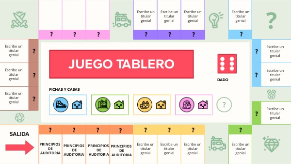 Cada jugador/a debe elegir un color: azul, verde, amarillo o rosa. Así obtiene una ficha para marcar su posición y 10 casas para indicar las propiedades que adquiere a lo largo del juego. Cada jugador debe coger la ficha de su color y colocarla en la casilla de salida. Para empezar a jugar, pincha sobre el dado y mueve tu ficha hasta la casilla que corresponda. En cada casilla debe haber una o varias preguntas. Si la aciertas, coloca una de tus casas en dicha casilla. ¡Enhorabuena, has conseguido una nueva propiedad! Casillas especiales: las casillas con iconos pueden contener sanciones como por ejemplo "El jugador paga impuestos de la luz: pierde 2 casas". ¡Acierta la pregunta para evitar la sanción! Ganará aquel jugador/a que tenga el mayor número de casas sobre el tablero una vez que todas las casillas estén ocupadas.