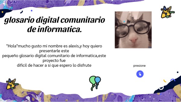 "Hola"mucho gusto mi nombre es alexis,y hoy quiero presentarle este pequeño glosario digital comunitario de informatica,este proyecto fue dificil de hacer a si que espero lo disfrute