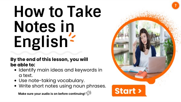 Writing “Pizza, cake, juice” is a correct example of a noun phrase for notes.