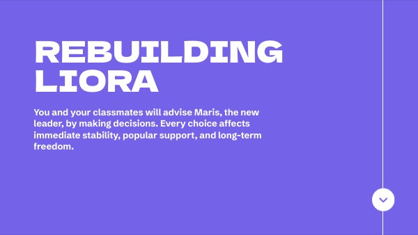You and your classmates will advise Maris, the new leader, by making decisions. Every choice affects immediate stability, popular support, and long-term freedom.