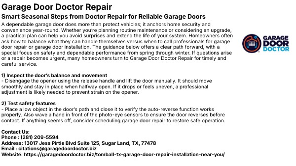 A dependable garage door does more than protect vehicles; it anchors home security and convenience year-round. Whether you’re planning routine maintenance or considering an upgrade, a practical plan can help you avoid surprises and extend the life of your system. Homeowners often ask how to balance what they can handle themselves versus when to call professionals for garage door repair or garage door installation. The guidance below offers a clear path forward, with a special focus on safety and dependable performance from spring through winter. If questions arise or a repair becomes urgent, many homeowners turn to Garage Door Doctor Repair for timely and careful service. 1) Inspect the door’s balance and movement - Disengage the opener using the release handle and lift the door manually. It should move smoothly and stay in place when halfway open. If it drops or feels uneven, a professional adjustment is likely needed to prevent strain on the opener. 2) Test safety features - Place a low object in the door’s path and close it to verify the auto-reverse function works properly. Also wave a hand in front of the photo-eye sensors to ensure the door reverses before contact. If anything seems off, consider scheduling garage door repair to restore safe operation. Contact Us: Phone : (281) 209-5594 Address: 13017 Jess Pirtle Blvd Suite 125, Sugar Land, TX, 77478 Email : citations@garagedoordoctor.biz Website: https://garagedoordoctor.biz/tomball-tx-garage-door-repair-installation-near-you/