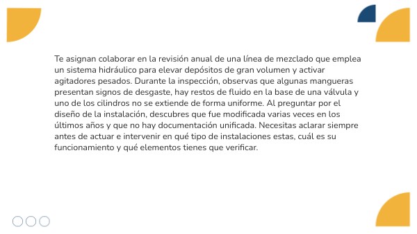 Durante el seguimiento de un fallo intermitente en una línea de prensado, detectas que uno de los cilindros no alcanza la presión esperada. El jefe de mantenimiento te pide revisar la unidad hidráulica, comprobar válvulas y verificar si algún componente necesita ser sustituido. No es suficiente con mirar el esquema: necesitas conocer con precisión qué hace cada elemento, cómo debería comportarse y qué síntomas presenta cuando algo no va bien. Para poder intervenir con criterio, tienes que dominar no solo el funcionamiento general, sino la estructura interna de los componentes clave del sistema.