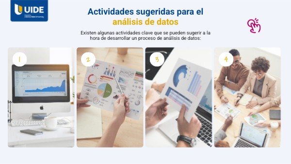 Existen algunas actividades clave que se pueden sugerir a la hora de desarrollar un proceso de análisis de datos: