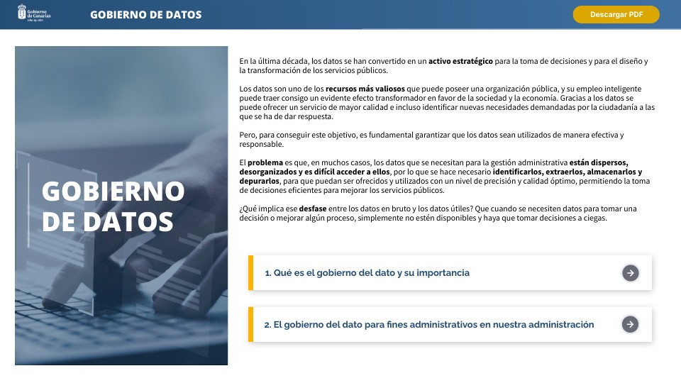 El Gobierno de Canarias, consciente de la importancia de los datos para la toma de decisiones y la mejora de los servicios públicos, aprobó el Decreto 84/2023, de 25 de mayo, por el que se regula el modelo de gobierno y gestión de datos para fines administrativos de la Administración Pública de la Comunidad Autónoma de Canarias y sus organismos públicos.