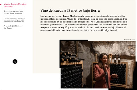 Las hermanas Reyes y Teresa Muelas, quinta generación, gestionan la bodega familiar ubicada al lado de la plaza Mayor de Tordesillas. El local se expande hacia abajo, en tres pisos de cuevas en las que elaboran y envejecen el vino. Organizan visitas con catas para iniciados y entendidos. Los túneles abovedados garantizan una humedad del 70% y unas temperaturas entre 10 y 15 grados todo el año. La uva dominante es verdejo, blanca, el emblema de Rueda; pero también elaboran tintos de tempranillo, algo inusual.