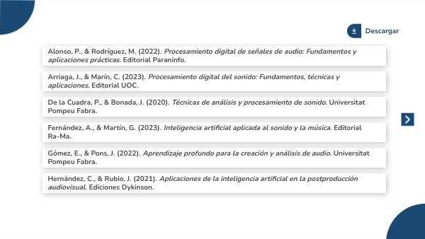 Fernández, A., & Martín, G. (2023). Inteligencia artificial aplicada al sonido y la música. Editorial Ra-Ma.