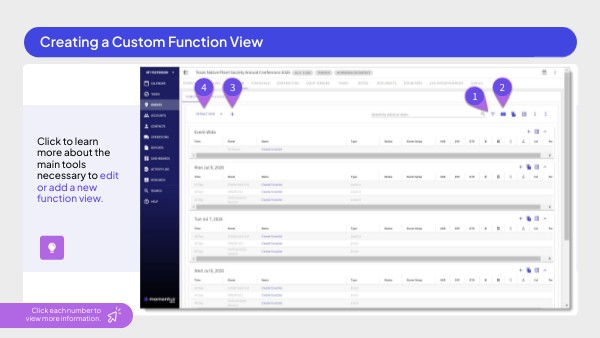 1. Filter Functions Remove current functions from view based on date, type, status, room, and more.