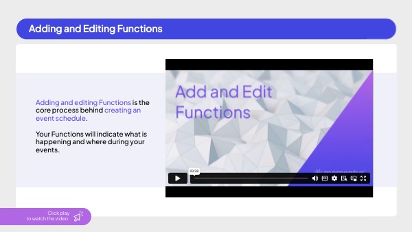 Adding and editing Functions is the core process behind creating an event schedule. Your Functions will indicate what is happening and where during your events.