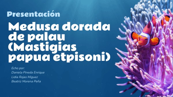 nombre cientifico: mastigias papua etpisomi habita en el lago marino aislado del oceano, con mezclas de agua salada y dulce dulce su color es dorado o marron amarillento, debido a la presencia de sus algas simbioticas en sus tejidos. su tamaño es diametro aproximado de 10 a 20 centrimetro cuerpo semitransparente con tentaculos cortos y gruesos, adaptado para no cazar activamente. no es peligrosa para los humanos sus organos es que no tienen cerebro, corazon ni huesos.