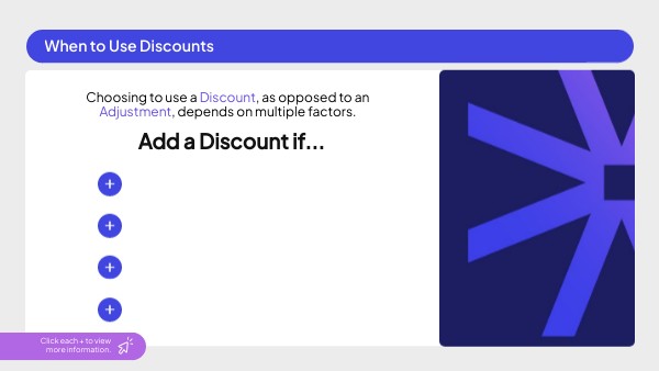 Choosing to use a Discount, as opposed to an Adjustment, depends on multiple factors.