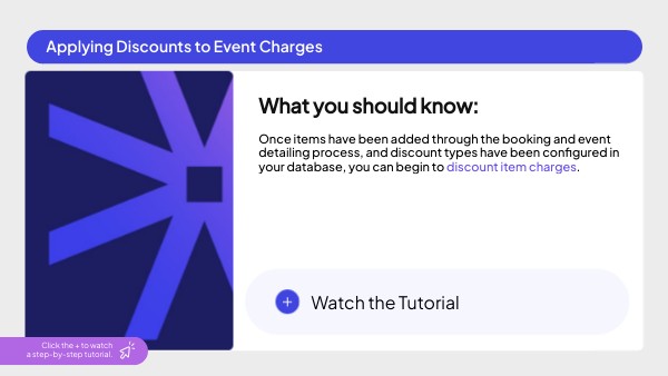 Once items have been added through the booking and event detailing process, and discount types have been configured in your database, you can begin to discount item charges.