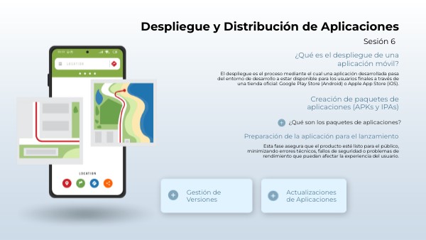 El despliegue es el proceso mediante el cual una aplicación desarrollada pasa del entorno de desarrollo a estar disponible para los usuarios finales a través de una tienda oficial: Google Play Store (Android) o Apple App Store (iOS).