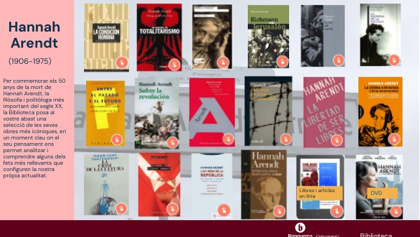 Per commemorar els 50 anys de la mort de Hannah Arendt, la filòsofa i politòloga més important del segle XX, la Biblioteca posa al vostre abast una selecció de les seves obres més icòniques, en un moment clau on el seu pensament ens permet analitzar i comprendre alguns dels fets més rellevants que configuren la nostra pròpia actualitat.