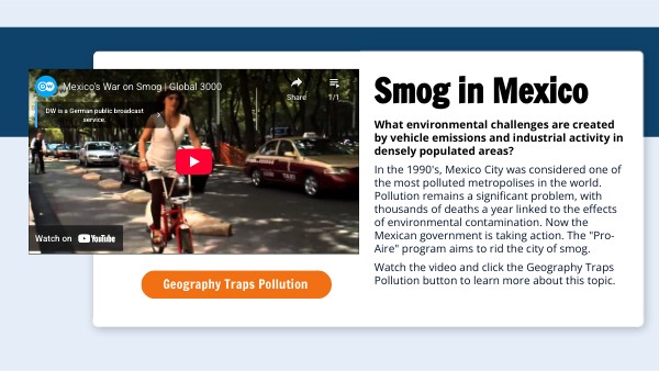 What environmental challenges are created by vehicle emissions and industrial activity in densely populated areas? In the 1990's, Mexico City was considered one of the most polluted metropolises in the world. Pollution remains a significant problem, with thousands of deaths a year linked to the effects of environmental contamination. Now the Mexican government is taking action. The "Pro-Aire" program aims to rid the city of smog. Watch the video and click the Geography Traps Pollution button to learn more about this topic.