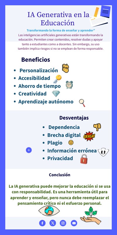 “Transformando la forma de enseñar y aprender” Las inteligencias artificiales generativas están transformando la educación. Permiten crear contenidos, resolver dudas y apoyar tanto a estudiantes como a docentes. Sin embargo, su uso también implica riesgos si no se emplean de forma responsable.