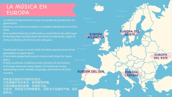 La música tradicional es la que ha pasado de generación en generación. Se toca y se canta en pueblos y ciudades desde hace muchos años. Nos cuenta historias, tradiciones y costumbres de cada lugar. En Europa hay muchos tipos de música tradicional, según el clima, el idioma y la historia de cada país. Traditional music is music that has been passed down from generation to generation. It has been played and sung in towns and cities for many years. It tells us stories, traditions, and customs of each place. In Europe, there are many types of traditional music, depending on the climate, language, and history of each country. 传统音乐是指代代相传的音乐。 它在城镇中流传多年,被演奏和传唱。 它讲述着各地的故事、传统和习俗。 在欧洲,传统音乐的种类繁多,这取决于各国的气候、语言和历史。
