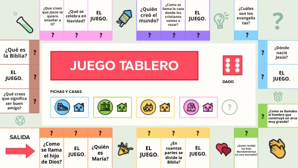 Cada jugador/a debe elegir un color: azul, verde, amarillo o rosa. Así obtiene una ficha para marcar su posición y 10 casas para indicar las propiedades que adquiere a lo largo del juego. Cada jugador debe coger la ficha de su color y colocarla en la casilla de salida. Para empezar a jugar, pincha sobre el dado y mueve tu ficha hasta la casilla que corresponda. En cada casilla debe haber una o varias preguntas. Si la aciertas, coloca una de tus casas en dicha casilla. ¡Enhorabuena, has conseguido una nueva propiedad! Casillas especiales: las casillas con iconos pueden contener sanciones como por ejemplo "El jugador paga impuestos de la luz: pierde 2 casas". ¡Acierta la pregunta para evitar la sanción! Ganará aquel jugador/a que tenga el mayor número de casas sobre el tablero una vez que todas las casillas estén ocupadas.