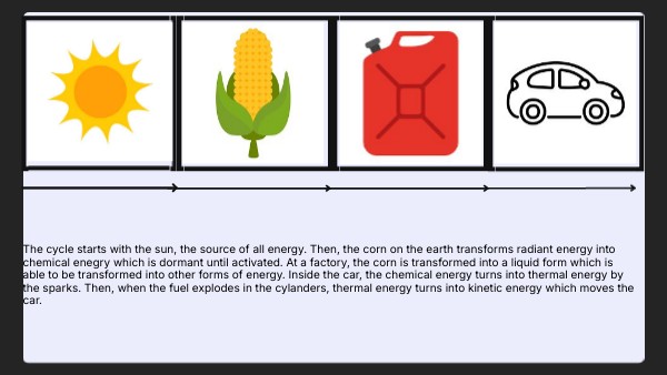 The cycle starts with the sun, the source of all energy. Then, the corn on the earth transforms radiant energy into chemical enegry which is dormant until activated. At a factory, the corn is transformed into a liquid form which is able to be transformed into other forms of energy. Inside the car, the chemical energy turns into thermal energy by the sparks. Then, when the fuel explodes in the cylanders, thermal energy turns into kinetic energy which moves the car.