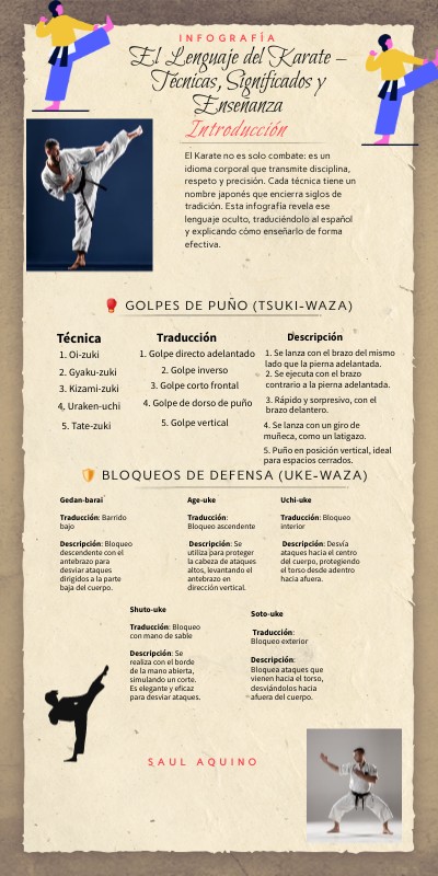 El Karate no es solo combate: es un idioma corporal que transmite disciplina, respeto y precisión. Cada técnica tiene un nombre japonés que encierra siglos de tradición. Esta infografía revela ese lenguaje oculto, traduciéndolo al español y explicando cómo enseñarlo de forma efectiva.