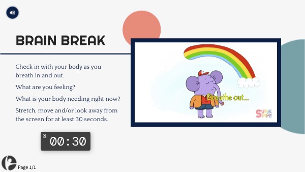 Ponga atención a su cuerpo mientras inhala y exhala. ¿Qué está sintiendo? ¿Qué necesita su cuerpo en este momento? Estírese, muévase o desvíe la mirada de la pantalla durante al menos 30 segundos.
