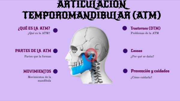 La ATM es la articulación que une la mandíbula con el hueso temporal del cráneo. Funciona como bisagra deslizante para hablar, masticar, bostezar y deglutir.