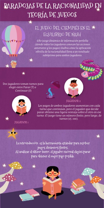 Este juego dinámico de información perfecta (donde todos los jugadores conocen las acciones anteriores y los pagos) ilustra cómo la aplicación estricta de la racionalidad lleva a un resultado subóptimo para ambos jugadores.