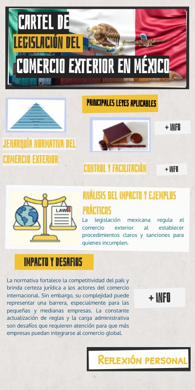 La Ley Aduanera regula el despacho de mercancías, los impuestos al comercio exterior y las sanciones por irregularidades. La Ley de Comercio Exterior establece medidas para proteger la economía nacional frente a prácticas desleales, como el dumping. También son clave la Ley del IVA y el Código Fiscal, que determinan la carga tributaria de las operaciones internacionales, así como la Ley de los Impuestos Generales de Importación y Exportación, que define los aranceles aplicables.