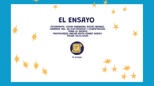 estudiante: Josue Emmanuel Rosas Mendez. Carrera: Ing. En Electrónica y computación. Tema: El ensayo Profesor(a): Imelda Edith Gómez Godoy. Fecha: 05/11/2025