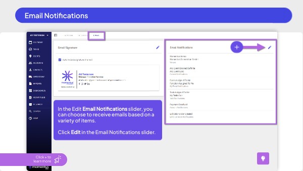 In the Edit Email Notifications slider, you can choose to receive emails based on a variety of items. Click Edit in the Email Notifications slider.