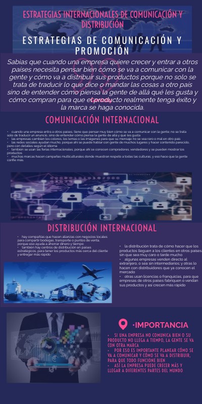 • la distribución trata de cómo hacer que los productos lleguen a los clientes en otros países, sin que sea muy caro o tarde mucho• algunas empresas venden directo al extranjero, o sea sin intermediarios; y otras lo hacen con distribuidores que ya conocen el mercado• otras usan licencias o franquicias, para que empresas de otros países fabriquen o vendan sus productos y así crecen más rápido