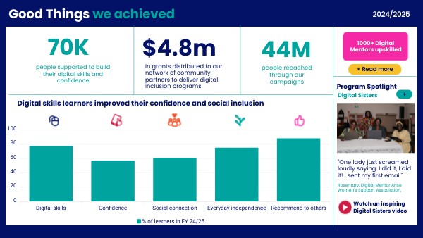 How we measure: Participants are asked to rate their confidence to use technology on a scale of 1-5 at baseline and after receiving training or support. Participants who improve upon their baseline score are counted as increasing their confidence. This new way of measuring increased confidence was introduced at 1 July 2024, meaning we cannot compare the results to previous years results.The Economic Benefits of Overcoming Digital Exclusion report, authored by economist Nicki Hutley, found that closing the digital divide could unlock nearly half a billion in annual economic benefits. Launched at Parliament House by the former Assistant Minister for Social Security, Women and Ageing, Kate Thwaites MP, it has informed government, business and sector priorities around productivity and participation, and provides a critical evidence base for ongoing advocacy. Check out the Economic Benefit Report Our Understanding AI Literacy and Digital Inclusion report examined how emerging technology affects people’s lives and learning. Featuring voices from learners, digital mentors and industry partners, it highlighted Good Things’ role as a leading voice on AI equity and inclusion. Check out the Understanding AI Literacy and Digital Inclusion Report The Australian Attitudes to Getting Online 2024 survey showed how cost of living pressures limit access to devices and data alongside the impact of rapid tech changes on digital confidence, sparking widespread media coverage and shaping our Get Online Week campaign that reached millions. Check out The Australian Attitudes to Getting Online 2024