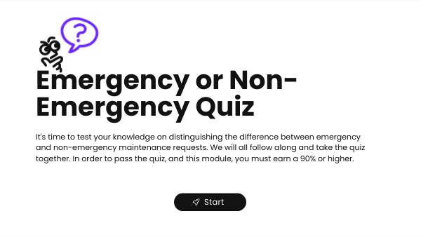 It's time to test your knowledge on distinguishing the difference between emergency and non-emergency maintenance requests. We will all follow along and take the quiz together. In order to pass the quiz, and this module, you must earn a 90% or higher.
