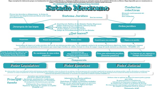 Mapa conceptual de elaboración propia con fundamentos de la Universidad Abierta y a Distancia de México (s.f.) en su contenido nuclear de la unidad 2. El Derecho en México. Mapa disponible para su visualización en : https://view.genially.com/690db7ee28be4ca115135bda/interactive-content-estado-mexicano