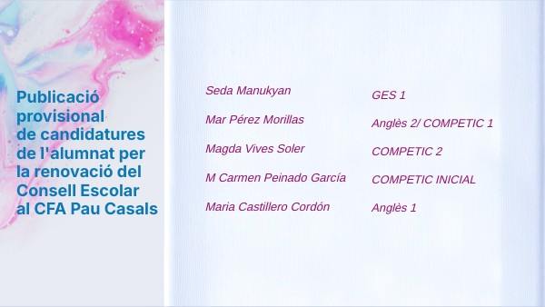 P ublicació provisional de candidatures de l'alumnat per la renovació del Consell Escolar al CFA Pau Casals